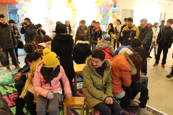 整个现场彩灯闪烁,各色气球漂浮在空中。活动始终由“香蕉树”乐队为整场伴奏,使整个场面沉浸在欢快的音乐动感中。本次活动既有“谁是卧底”、“小九九”、“拍七令”小游戏,又有套圈游戏这类火热娱乐小游戏,另外还特设了简易的棋牌室供同学们放松和娱乐,大家都拼的不亦乐乎。各个活动专区里都有专门的主持人、富有娱乐精神的参与者和热情搞笑的观众。大家伙一起把狂欢会搞得精彩迭出,高潮不断,笑声掌声此起彼伏。此外员工会成员特意为胜利者购置了精美的礼品,让同学们在玩的过程中有所收获。而最吸引同学们的还是“厨房”里为大家准备的各种好吃的面点。在满足同学们精神需求的同时,又照顾了大家的物质需求,边吃边喝,边看边笑,边闹边乐,成为狂欢会的一道靓丽风景。值得一提的是,本次活动还为同学们提供了寿司和蛋糕等美食。最热闹的当属现场DIY包饺子活动以及自助水果沙拉活动。这不禁让我们有着大家一起提前过年的感觉,同学们在自给自足中享受着这份辛劳与快乐。