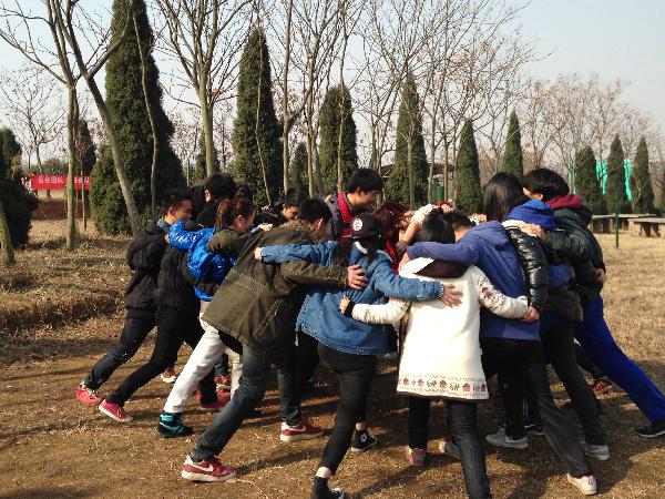 上午到达户外实践基地,教练将所有同学分为六个小组,由各组分别想出自己的队名、队徽、队歌。同学们积极配合,通力协作,互相商量。无论是热情似火的烈焰队,还是变幻莫测的雷霆队,还是美丽惊艳的凤凰队,每个队心目中似乎都坚守着“信在团队,建在团队,成在团队,赢在团队”的信条。在信任背摔环节中,为了防止摔倒的危险,每组男女生队员们通力合作,共攀人墙,并不时地为准备起跳的同学加油打气,充分展现了同学们的团队精神。