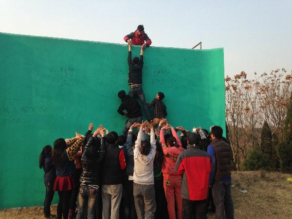 在下午的活动中,同学们迎来了挑战。一堵约4.6m的光滑的高墙伫立在大家眼前,为了考验同学们的团队合作精神,吴教练带领大家开始做攀岩前的准备工作。最后由员工会主席张琪担任主持,带领大家攀上高墙。经过一番热烈的讨论,男生们毫不犹豫地冲到最前面做起了人墙,另外的男生们则陆陆续续的托举着女生们,将他们送往高墙之上。而站在人墙外层的同学们将手高举头顶,保护正在往上攀的同学。看到同学们如此投入,特别是人墙最底层的那些小伙子们肩膀酸痛,却依然咬着牙坚持下去,着实感动着现场的每一个人。最终在同学们的一致努力下,这堵四米六的高墙终于踩在同学们的脚底。所有的同学们都在体验着团队的力量。
