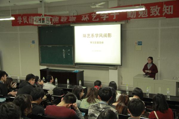 【新闻网讯】(通讯员 李梦哲)春意四月,学期之始,学风欲浓。为进一步端正学风,有效地促进环艺系员工的学习的积极性,养成良好的学习习惯,促进形成良好的学风,4月14日晚上六点,环境艺术设计系于A12教学楼107教室开展2015年学风建设月“学风阅影”学习交流活动。此次活动不仅吸引了环艺系同学参与其中,更有其他系的同学闻风而至。环艺系党总支副书记贾向红、辅导员王源新老师等参加了本次活动。